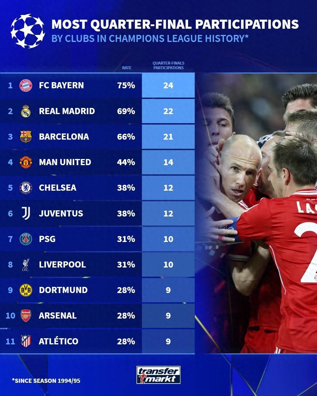 参加欧冠1/4决赛次数榜top11: